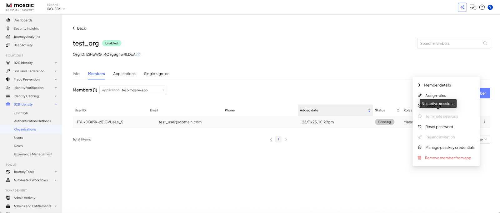 Tenant admins and Organizational admins gained the ability to terminate a member’s active session directly from the Admin Portal, giving organizations tighter control over access and improving security across B2B environments. Ending a session immediately invalidates the user’s refresh token, ensuring that the next refresh attempt fails and triggers a logout flow in the application.