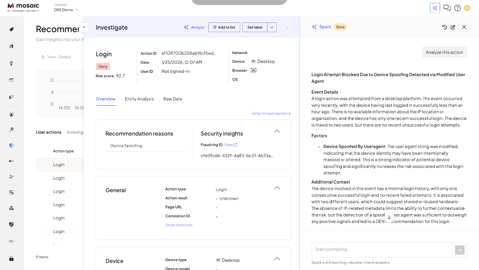 Risk analysis becomes faster and more transparent with Spark now available directly within the Investigate tab on the Recommendations page. Analysts can use Spark to instantly analyze and explain flagged activity, turning complex signals and events into clear, contextual narratives.
