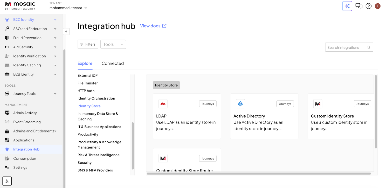 The Integration Hub emerged as Mosaic's marketplace for connecting third-party solutions and other external services, bringing together a catalog of prebuilt integrations alongside support for fully custom connections. It allows teams to incorporate communication tools, data systems, analytics platforms and security services into both real-time user journeys and offline operational workflows, improving coordination between identity processes and the broader systems organizations rely on.