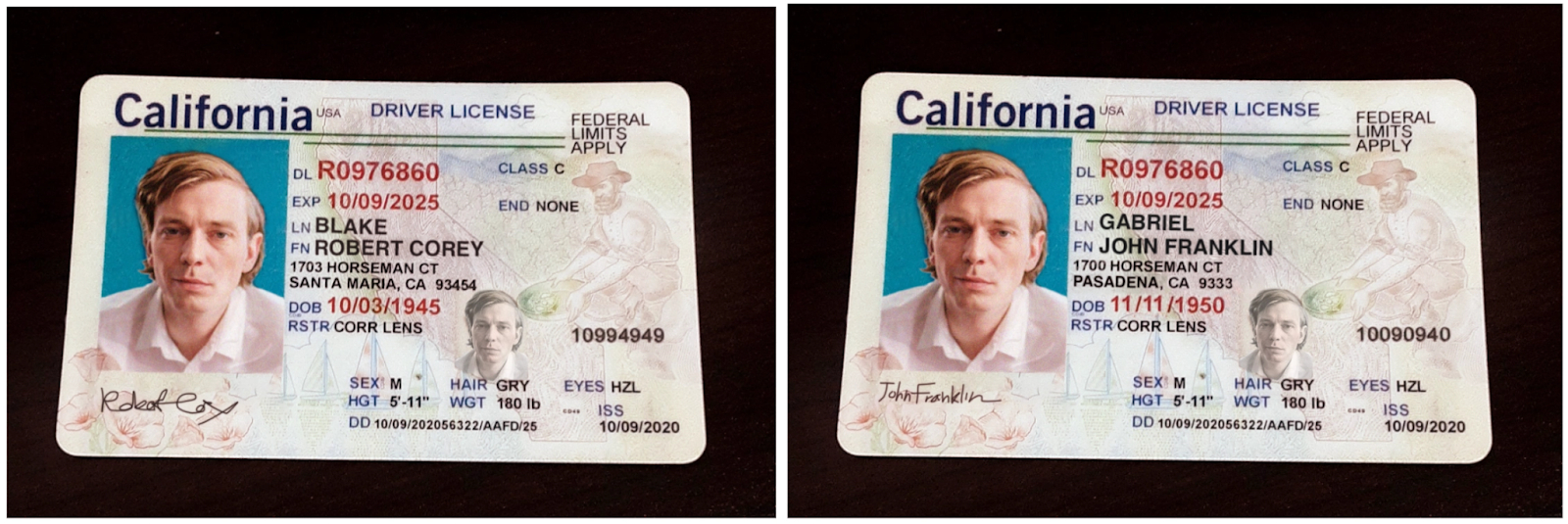 Synthetic IDs using the same face with different personal information.